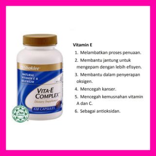Assalammualaikum Happy Weekend semua. Satu kapsul menyediakan 400IU vitamin E dari sumber semula jadi daripada minyak kacang soya dalam bentuk D-alfa-tokoferol yang merupakan bentuk aktif. Vita-E Complex Vitamin E 120 capsules.