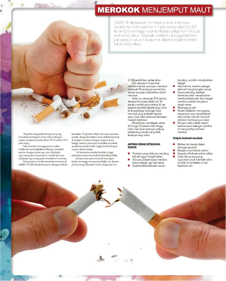 Menurut Pertubuhan Kesihatan Sedunia WHO pada tahun 2020 dianggarkan 10 juta orang perokok di dunia telah mati dalam setahun. Kesan-kesan Kesihatan dari Merokok Merokok menyebabkan penyakit serius dan ketagihan Apabila rokok dinyalakan tembakau dibakar dan menghasilkan asap. Merokok juga menjadi punca berbagai-bagai jenis penyakit kepada sistem autoimun tulang jantung darah penglihatan dan.